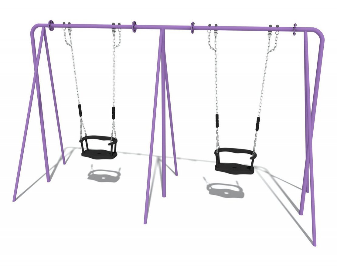 Стойка качели из трубы сечением Ø 42 мм и 32 мм, металл имеет плавные радиусы, тщательную обработку швов, покрыт порошковой краской. Подвес из металлической цепи диаметром не менее 5 мм. Сиденья качелей изготовлены из влагостойкой окрашенной фанеры толщиной 18 мм. Каркас из трубы сечением Ø 22 мм. Деревянные детали должны быть тщательно отшлифованы, загрунтованы и окрашены профессиональными двухкомпонентными красками в заводских условиях.