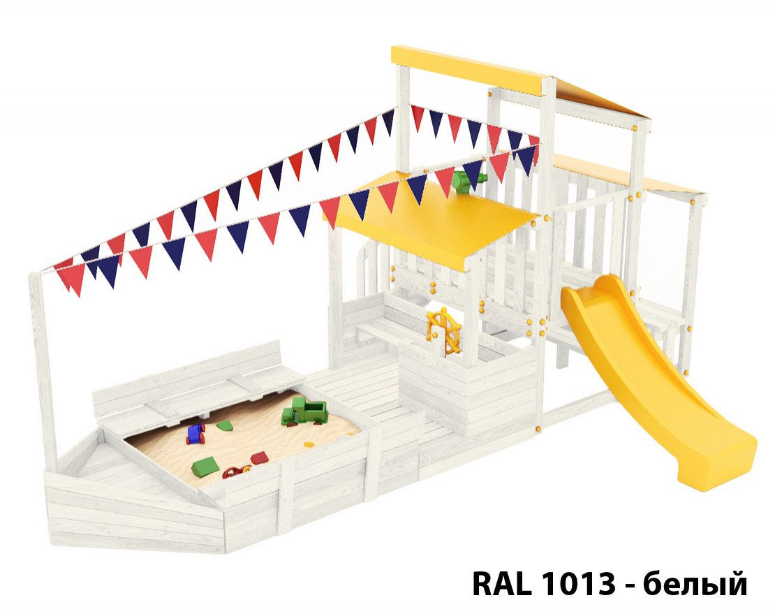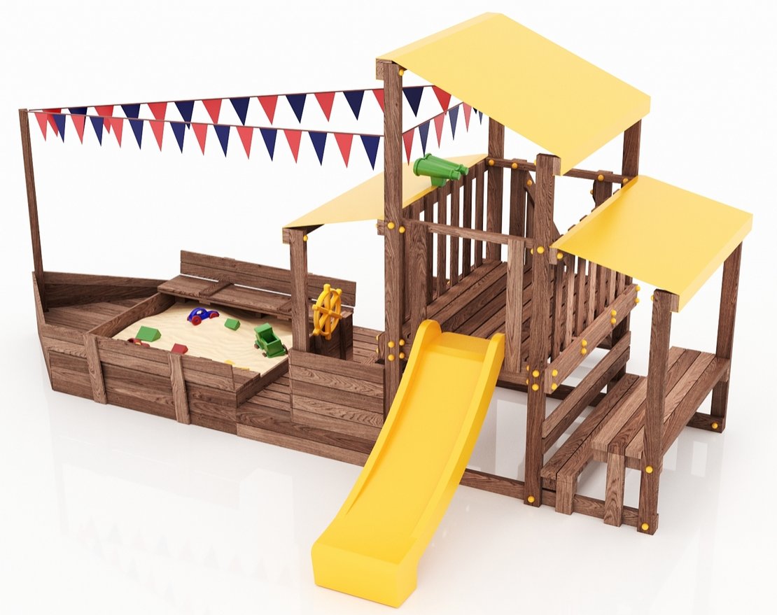 Детская песочница с крышкой-лавочкой и кораблик, включающий в себя штурманскую рубку и капитанский мостик с горкой с высоты 900 мм с флажками.