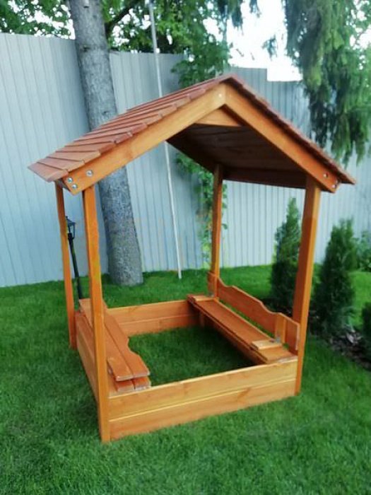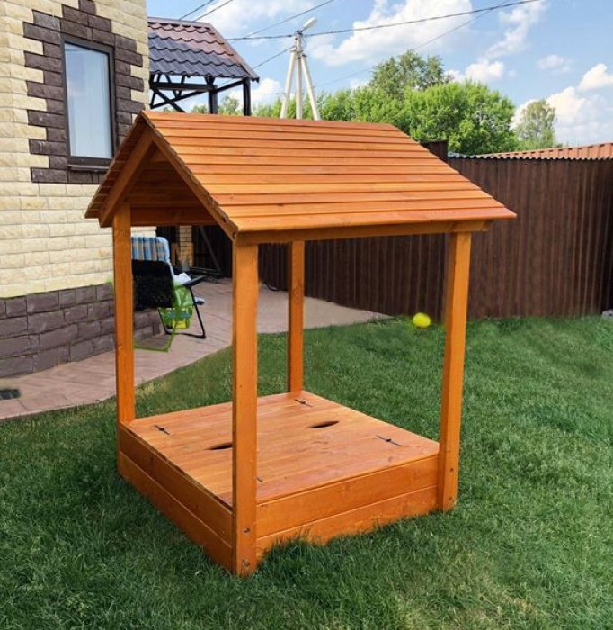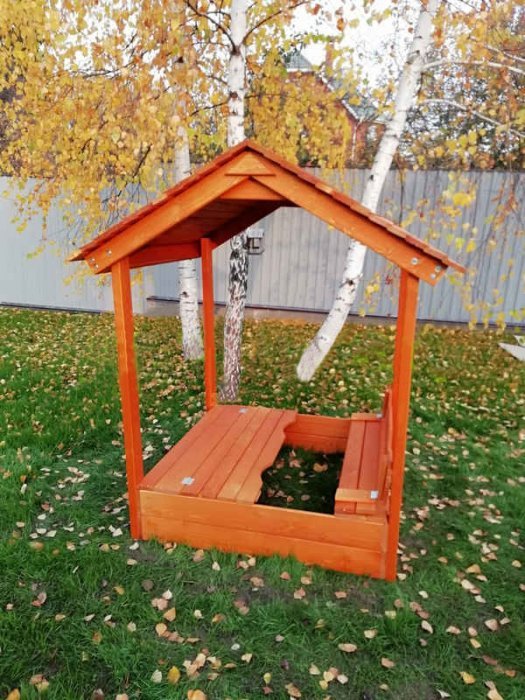 Детская деревянная песочница с крышей для дачи также подойдет. В то время, когда родители заняты сезонно-полевыми работами, ребенок сможет заняться песочной архитектурой: строить замки и песочные городки. Единственное, на что следует обратить внимание заботливым родителям: никакой еды во время игр с песком.