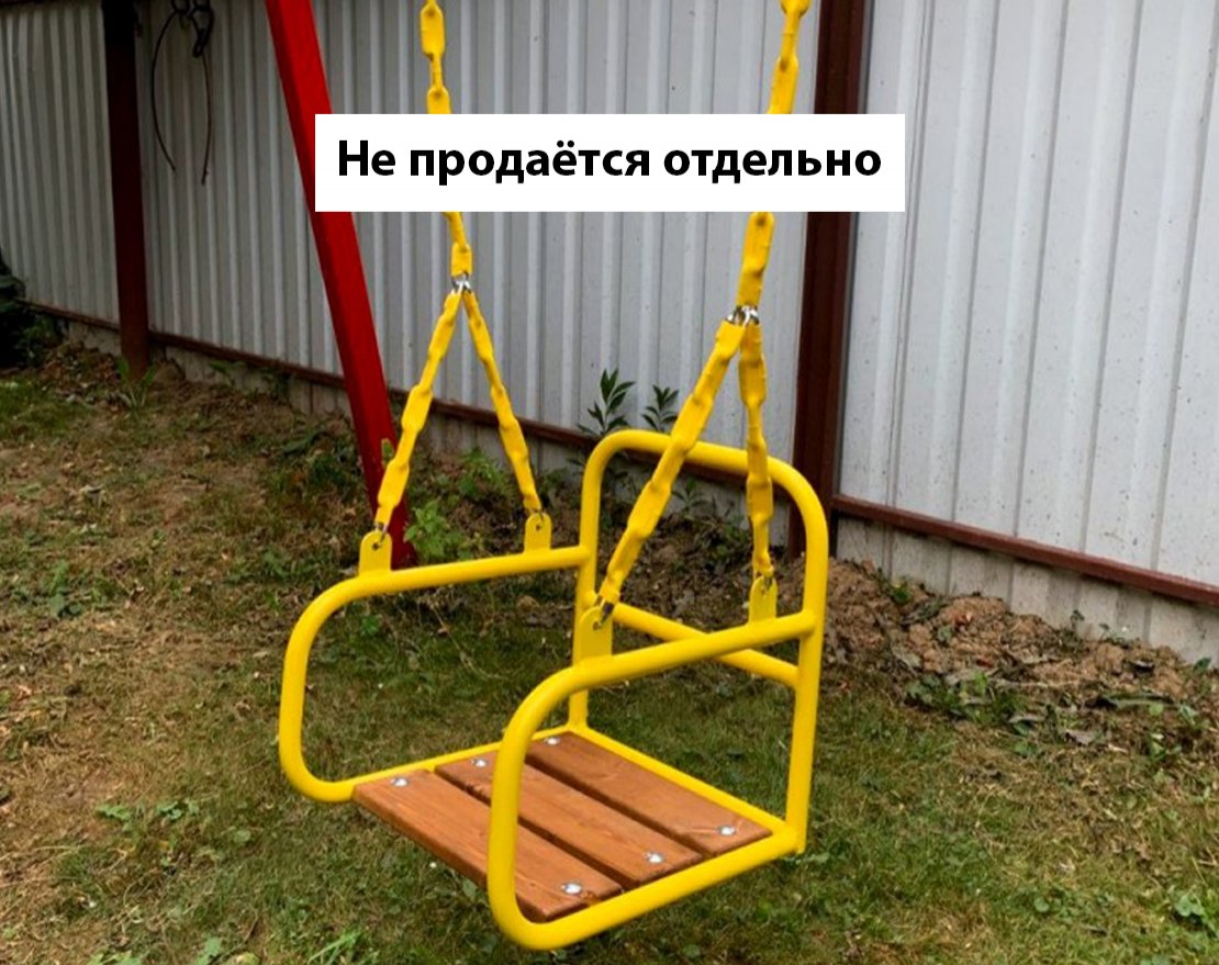 Качели со спинкой выполнены из металлического каркаса и деревянного сидения. Спинка сидушки качели позволяет ребенку удобно сидеть, а специальный ограничитель, расположенный спереди на изделии, способен уберечь от случайных падений ребенка.