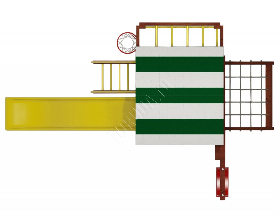 - Удобство для детей и родителей: конструкция продумана до мелочей: игровая башня с крышей защищает от солнца и осадков, песочница с лавочкой позволяет детям играть с комфортом, а баскетбольное кольцо со щитом добавляет разнообразие в игры.