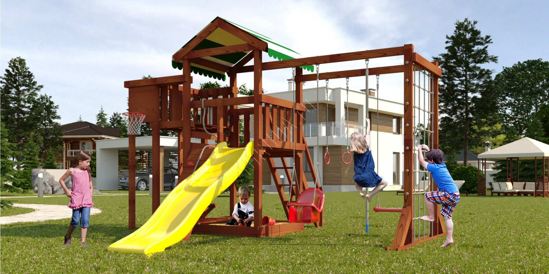 Укреплять мышечный каркас нужно с детства, бросая мяч в баскетбольное кольцо, вися на турнике и кольцах, карабкаясь по шведской стенке, канату, сетке-лазалке. Все это многообразие спортивных снарядов присутствует в Гарда 4 Бри. Для большей радости качели «Лодочка» и «Люкс» со спинкой.