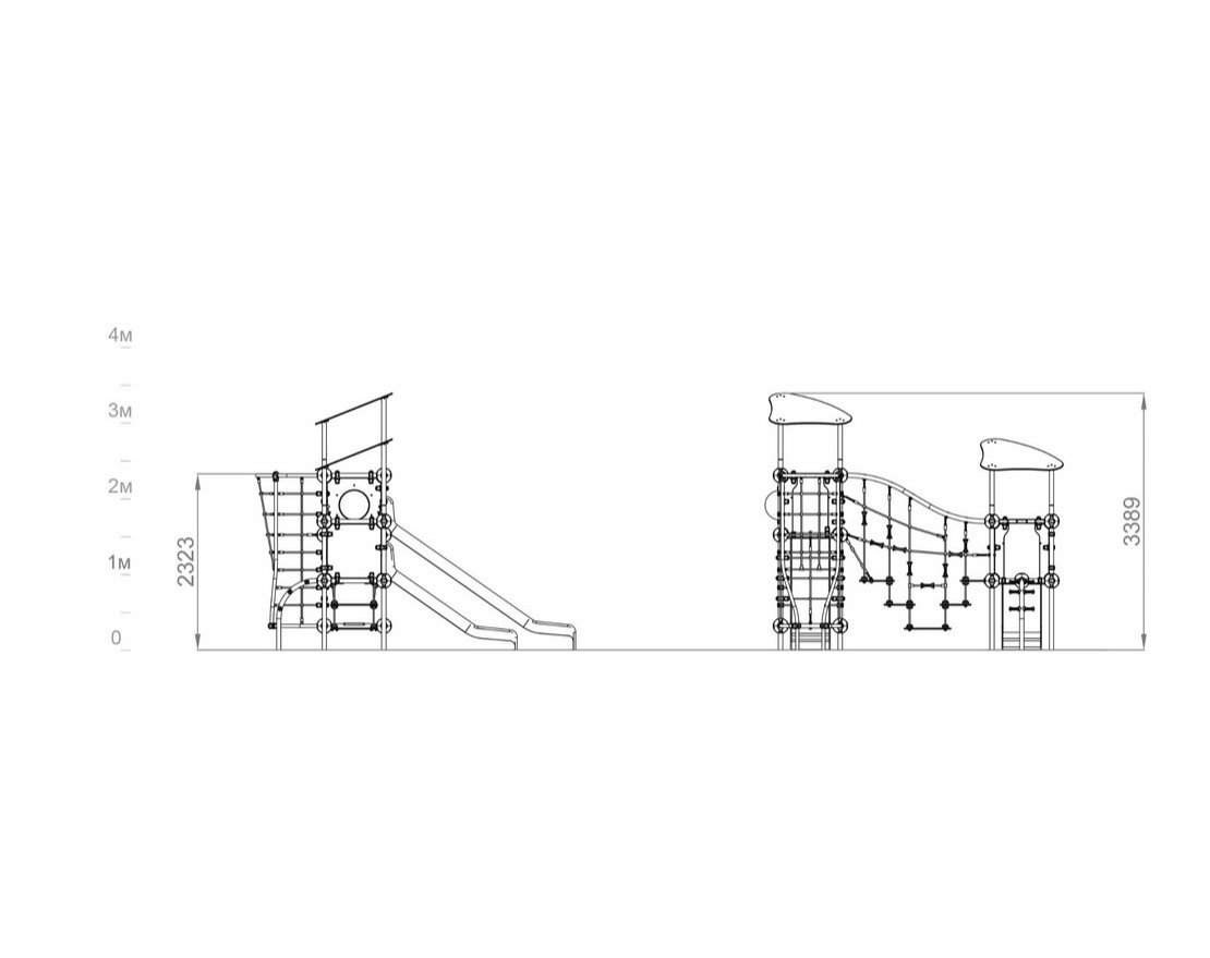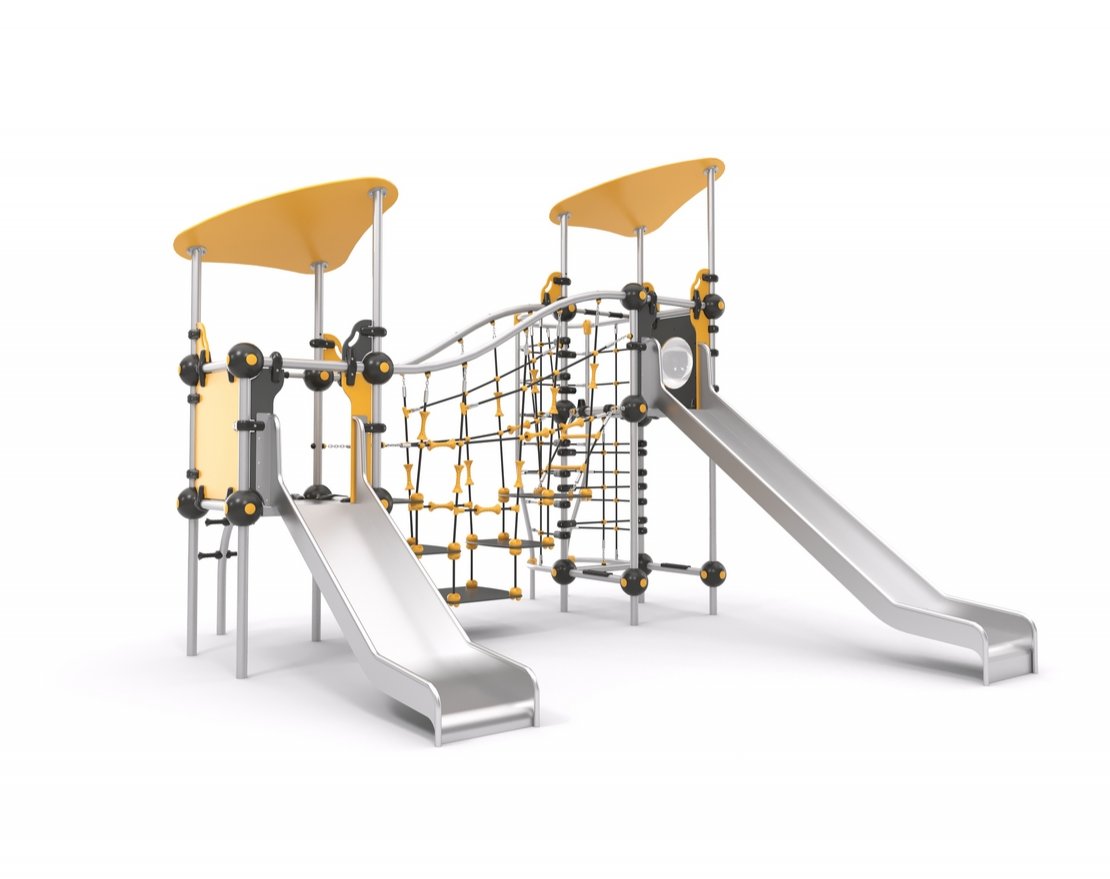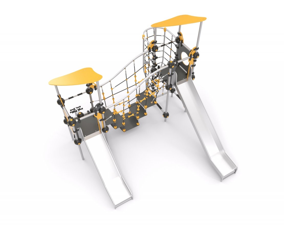 Состоит из металлического каркаса, канатной сетки, ограждения, мостика, двух открытых горок и вставки с иллюминатором.