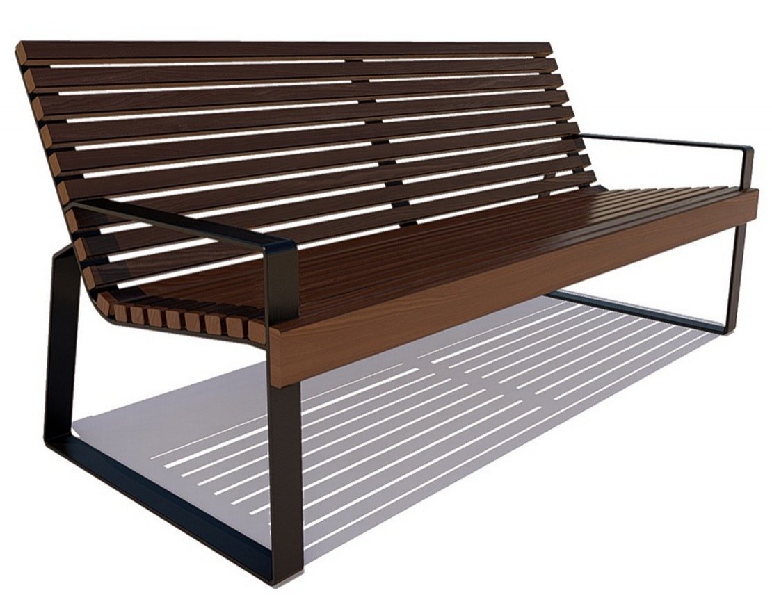 Скамейка Белгород в современном стиле. Минималистичные стальные боковины плавно перетекают в практичные подлокотники. Эргономичные спинки позволяют быстро расслабиться.