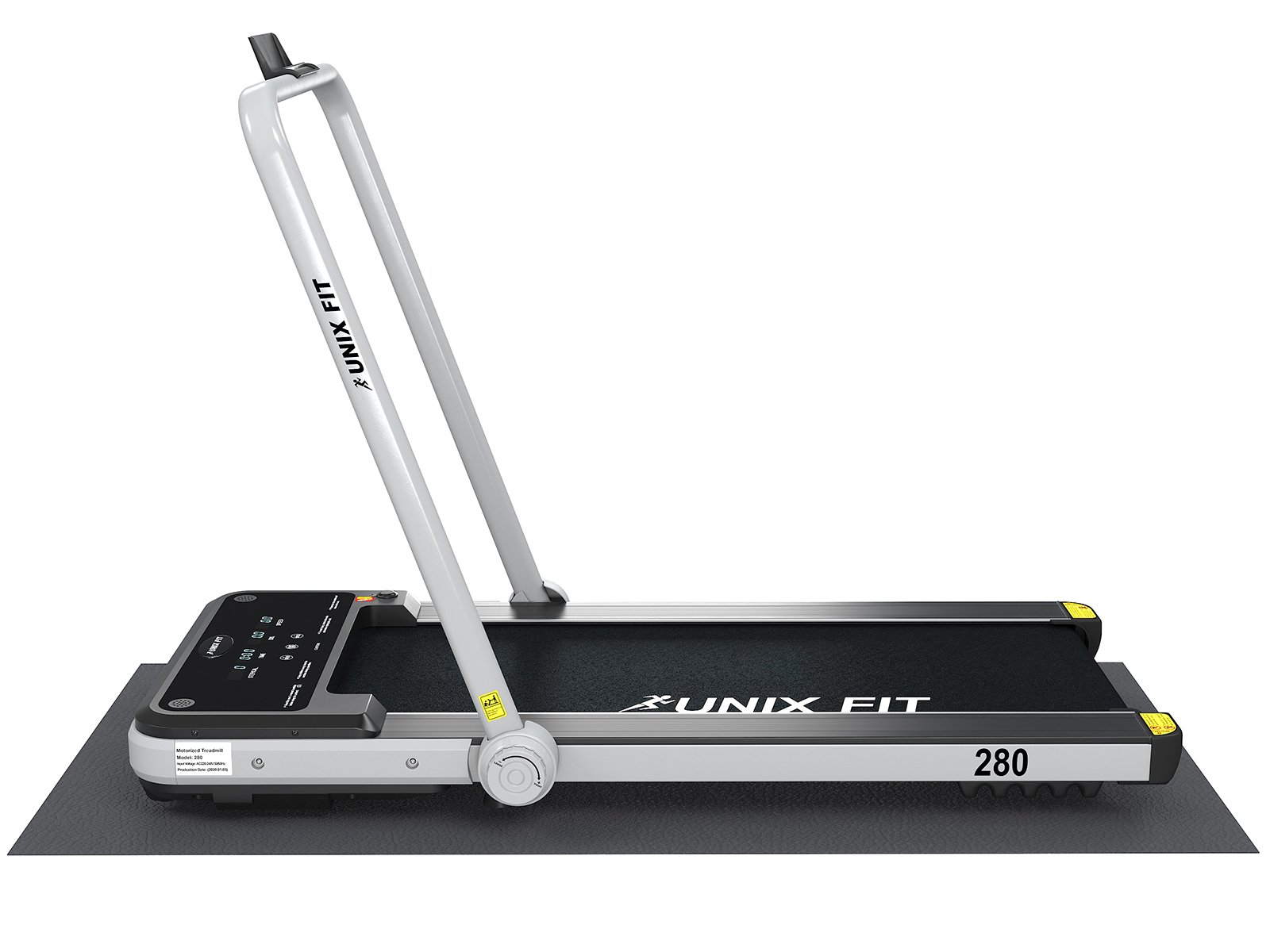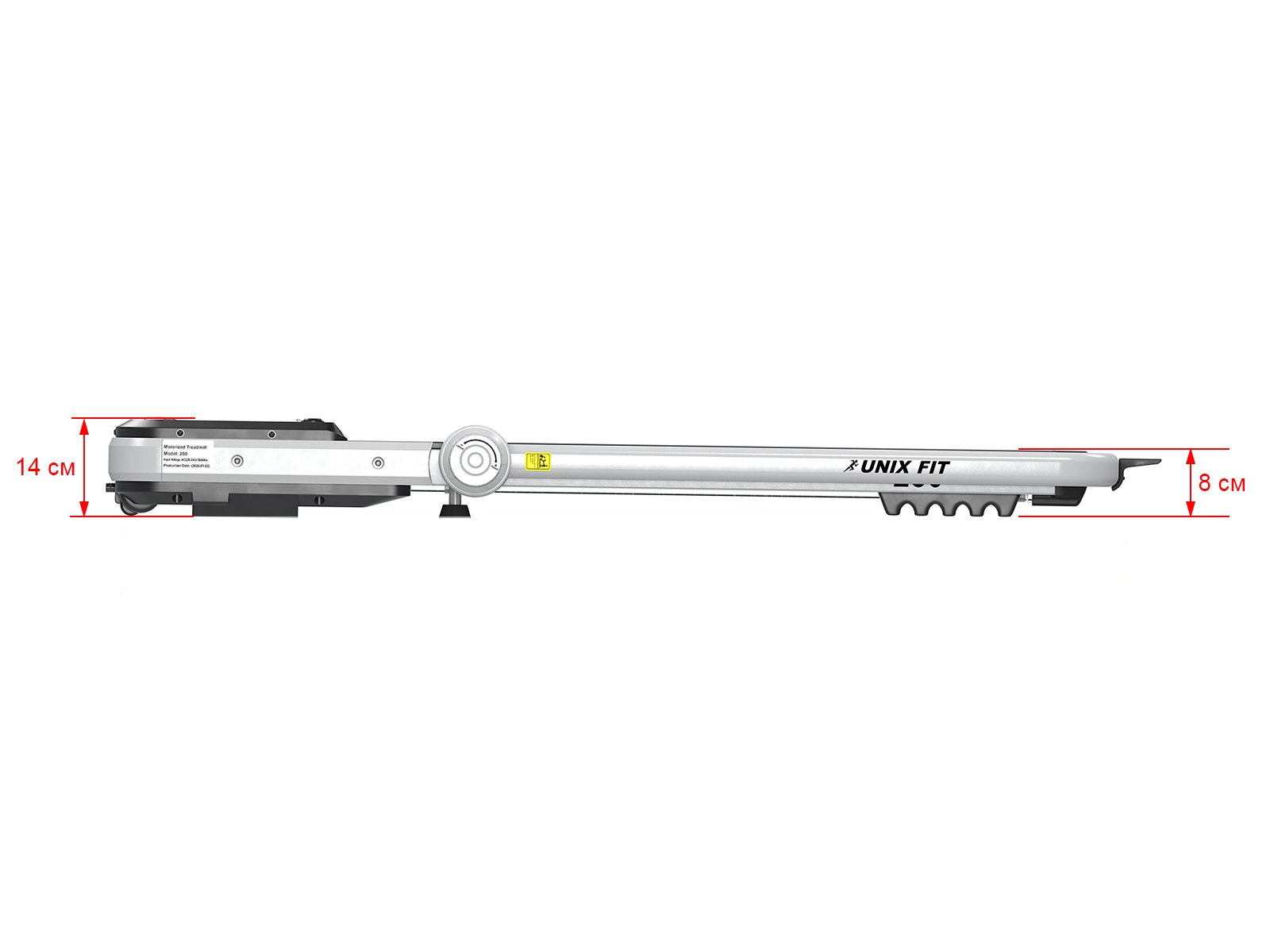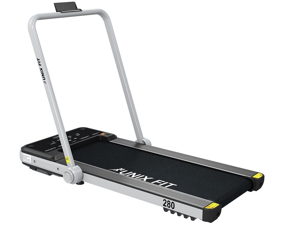 Беговую дорожку UNIXFIT R-280 можно убрать под диван или за дверь (толщина рамы составляет всего 14 см). Трехслойное беговое полотно (42,5*108 см) оптимально подходит для умеренных физических нагрузок, максимальная скорость бега составляет 10 км/ч.