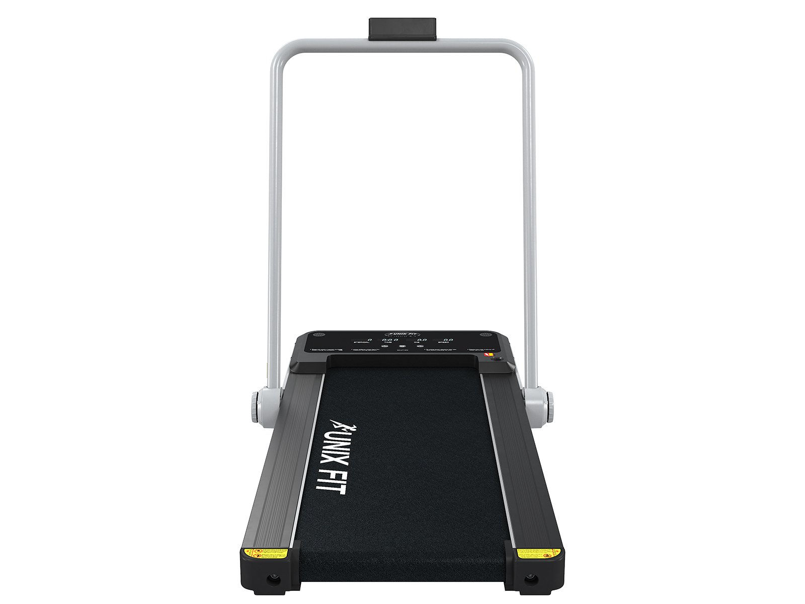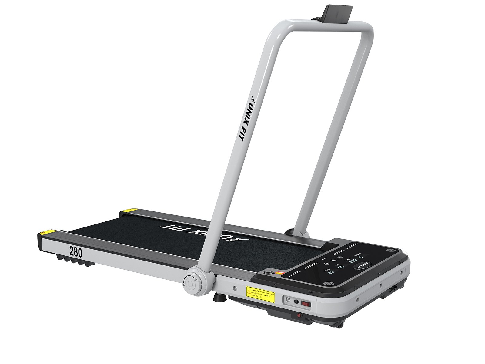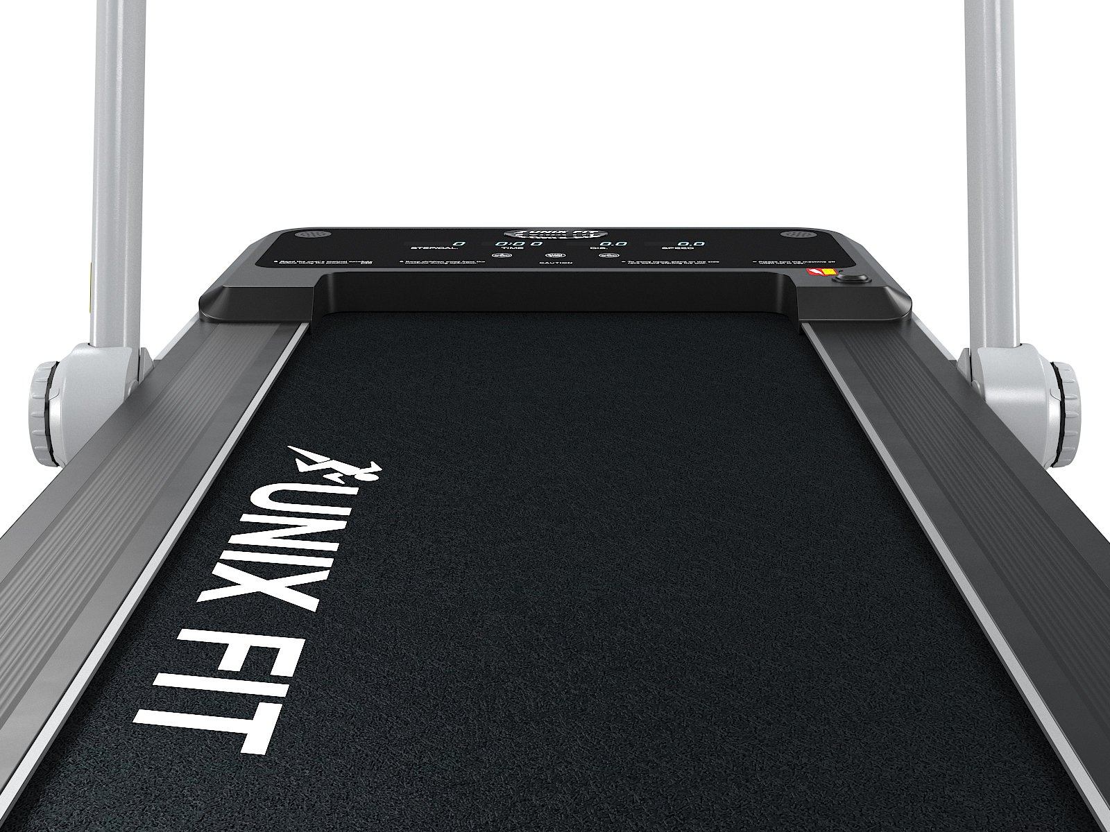 Беговую дорожку UNIXFIT R-280 можно убрать под диван или за дверь (толщина рамы составляет всего 14 см). Трехслойное беговое полотно (42,5*108 см) оптимально подходит для умеренных физических нагрузок, максимальная скорость бега составляет 10 км/ч.